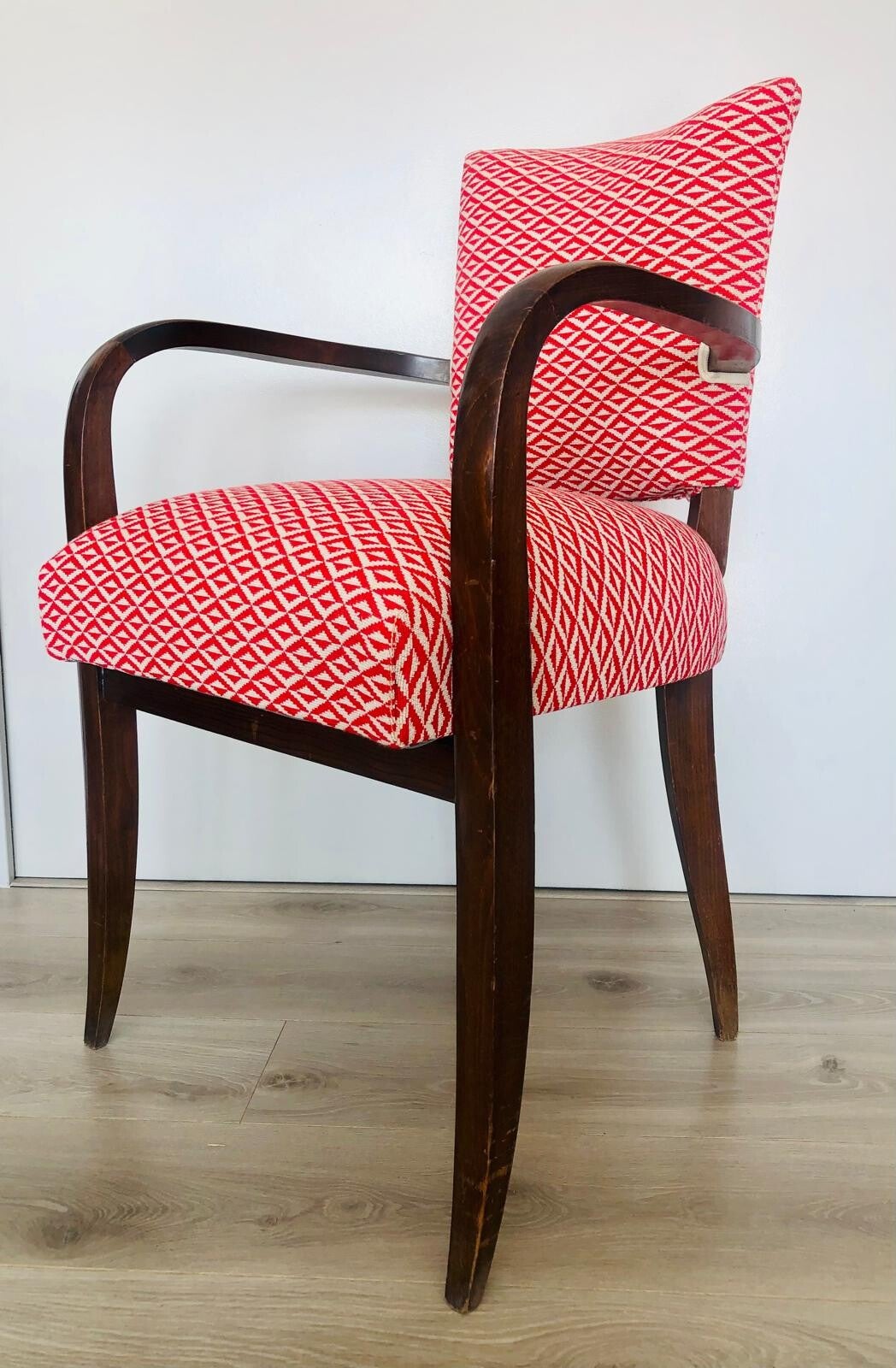 Piétement et accotoirs d’un seul tenant, tissu origami Lelièvre (Réf Origami rouge et crème). Garnissage demi-traditionnel, ressorts sur sanglage pour l’assise; dossier offrant un très joli galbe, finition passepoil crème Houlès discret aux accotoirs.